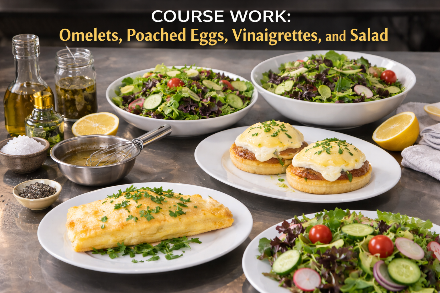 Day 24: Practical Check #3: Omelet, Poached Egg, Vinaigrette, and Salad (Timed)